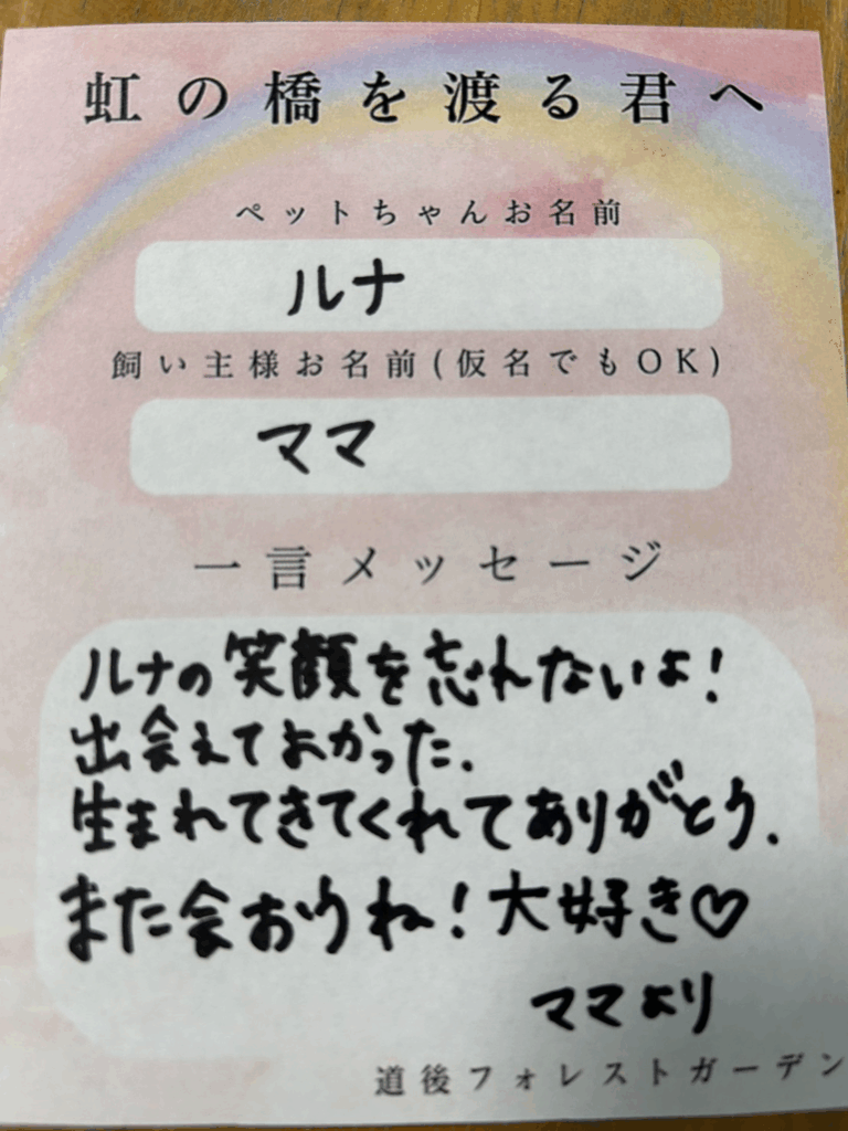 虹の橋を渡る君へ(飼い主様からのメッセージ)