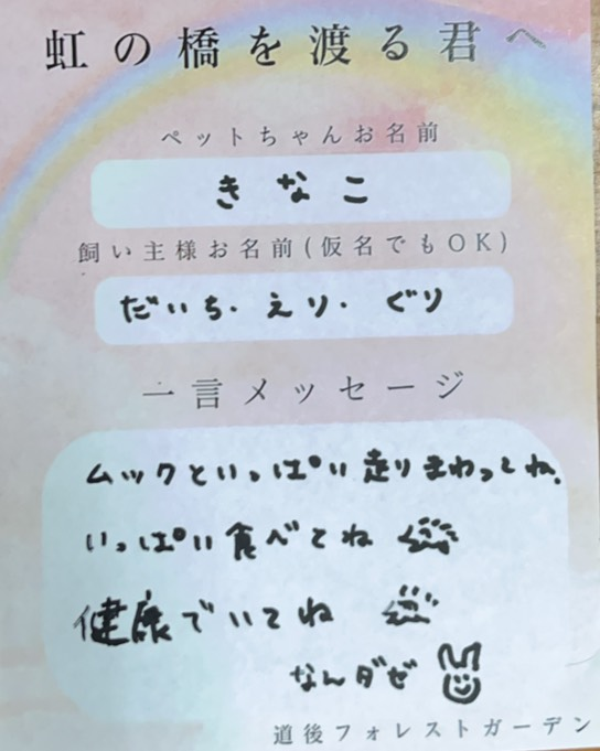 虹の橋を渡る君へ(飼い主様からのメッセージ)