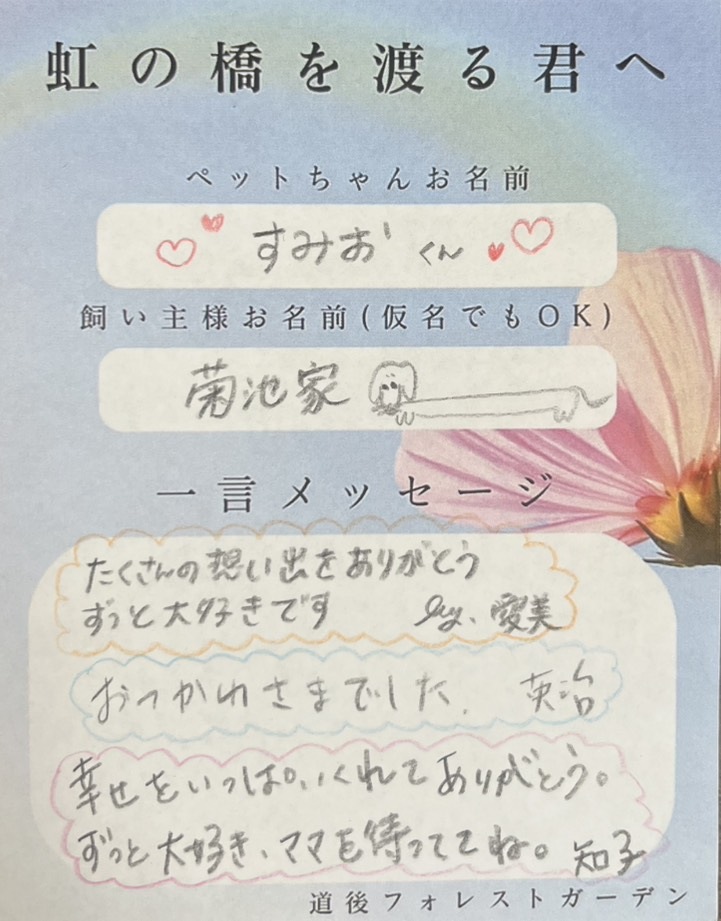 虹の橋を渡る君へ(飼い主様からのメッセージ)