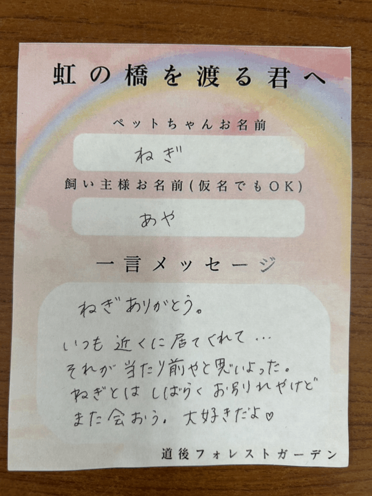 虹の橋を渡る君へ(飼い主様からのメッセージ)