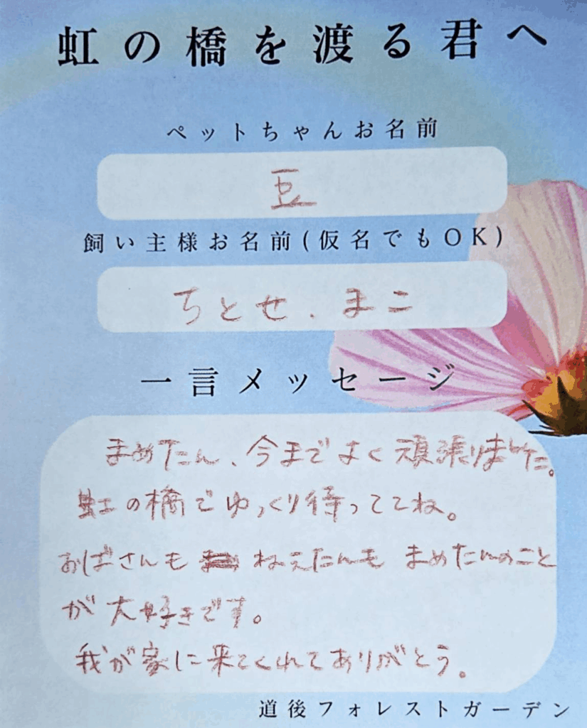 虹の橋を渡る君へ(飼い主様からのメッセージ)