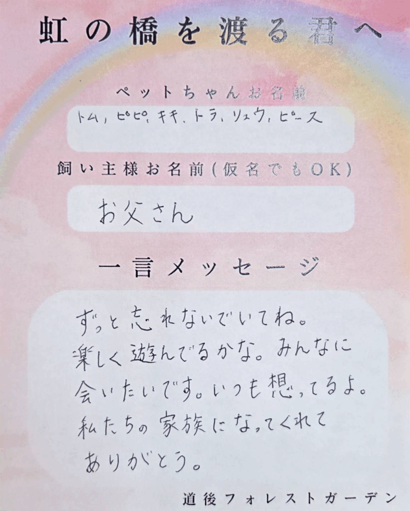 ずっと忘れないでいてね。楽しく遊んでるかな。みんなに会いたいです。いつも想っているよ。私たちの家族になってくれてありがとう。