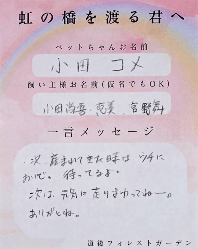 虹の橋を渡る君へ(飼い主様からのメッセージ)