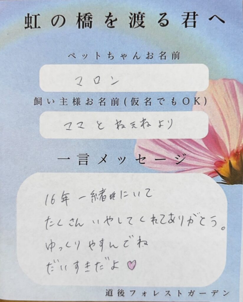 虹の橋を渡る君へ(飼い主様からのメッセージ)