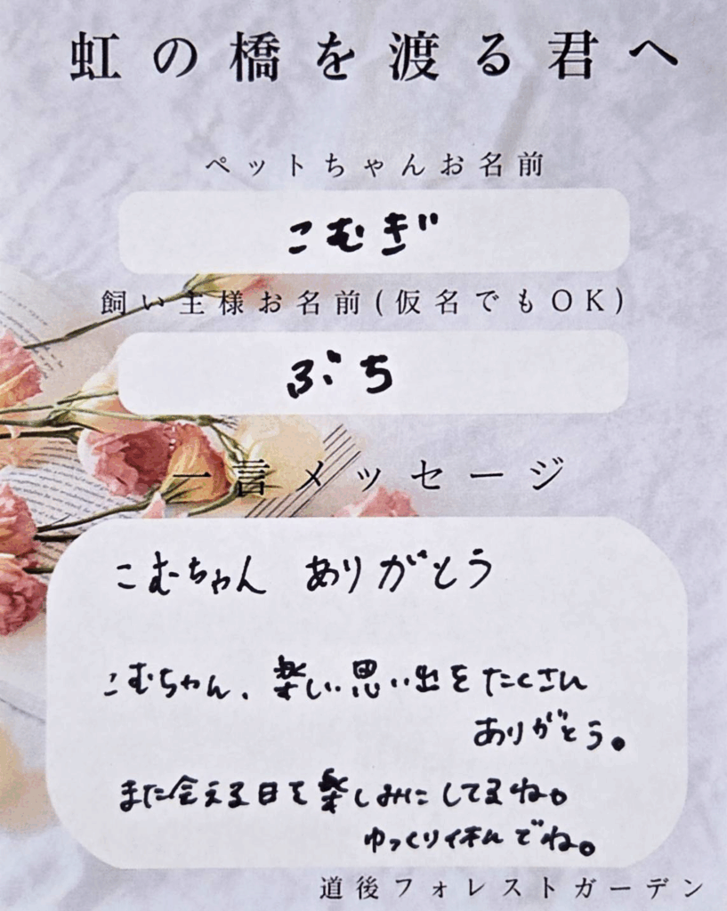 こむちゃん ありがとうこむちゃん、楽しい想い出をたくさんありがとう。また会える日を楽しみにしてるね。ゆっくり休んでね。
