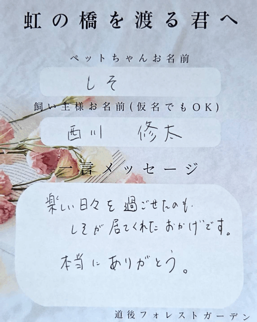 虹の橋を渡る君へ(飼い主様からのメッセージ)
