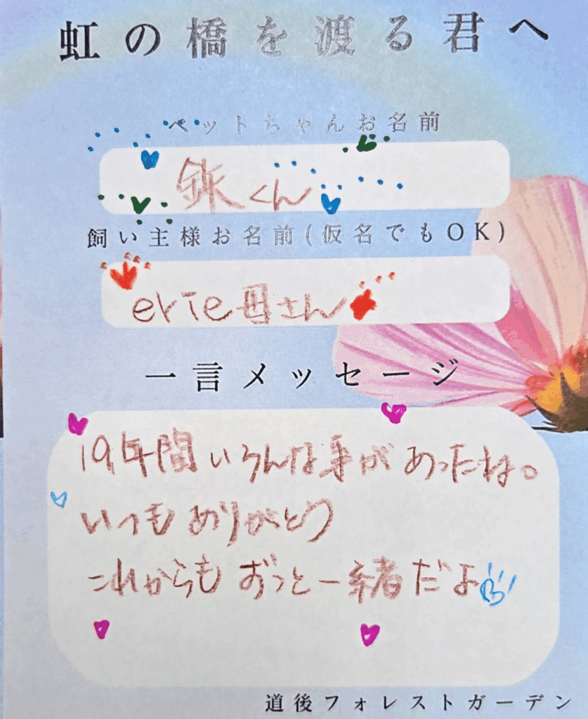 虹の橋を渡る君へ(飼い主様からのメッセージ)